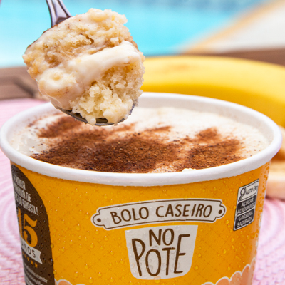 Camadas deliciosas de um bolo bem molhadinho, recheio especial de banana caramelizada e uma deliciosa cobertura com um leve toque de canela. Tudo dentro do potinho!