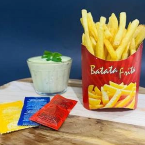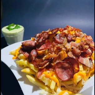 Batata G com mussarela, cheddar, bacon e calabresa.