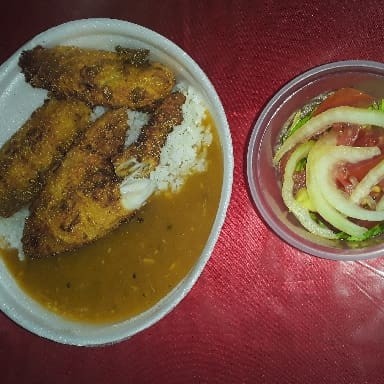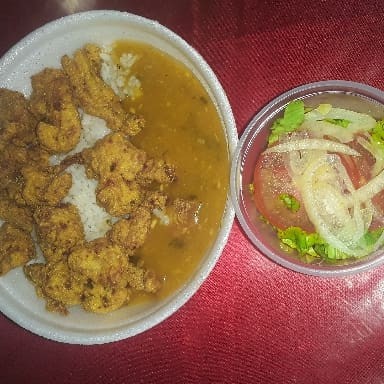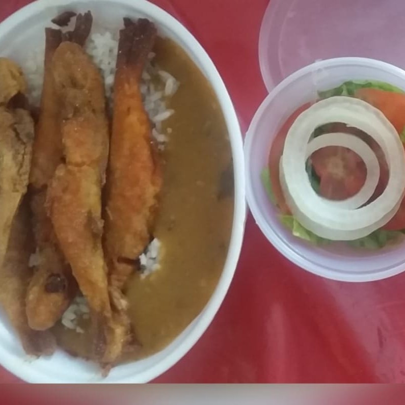 1 quentinha grande de gurjao de linguado 1 quentinha de arroz 1 quentinha de pirão 1 quentinha de salada