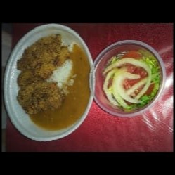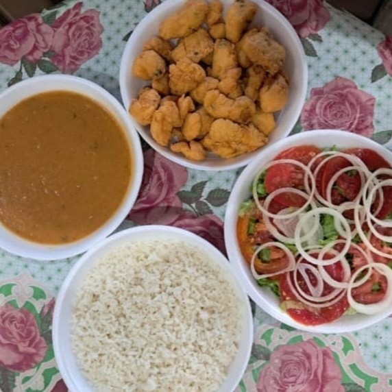 1 quentinha pequena de gurjao de linguado 1/2 quentinha de arroz 1/2 quentinha de pirão 1/2 quentinha de salada