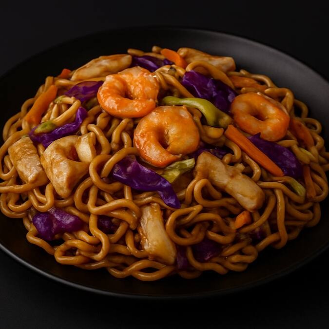 Deliciosa macarronada oriental com carne, frango, camarão, repolho e cenoura ao molho e óleo de gergelim. Vai com 600g.
