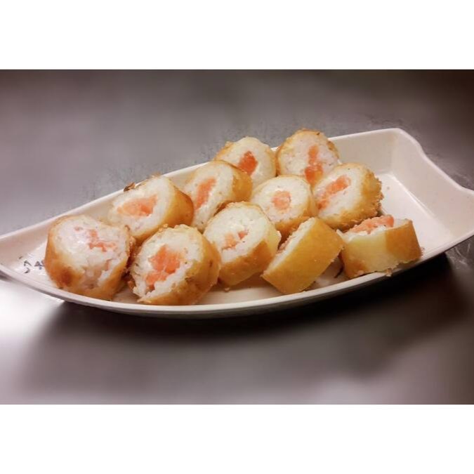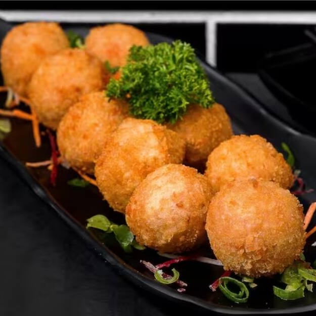 20 pecas de bolinha de arroz, cream cheese, pequeninos pedaços de salmao e cebolinha empanada e frita.