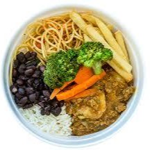 Quentinha de strogonoff de frango acompanhando arroz, batata palha e salada de alface e tomate. Esta configuração não pode ser alterada.