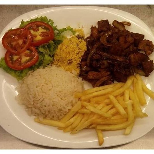 Acompanhado com arroz, salada, farofa e batata frita.