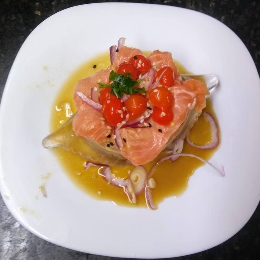 10 sashimi de salmão, 6 sushi salmão, 8 sakemaki