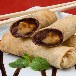 Enrolado de arroz, salmao e cebolinha na massa de harumaki.