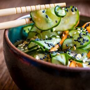 Uma irresistível salada de pepino com kani e gergelim.