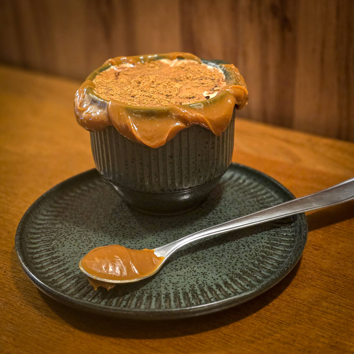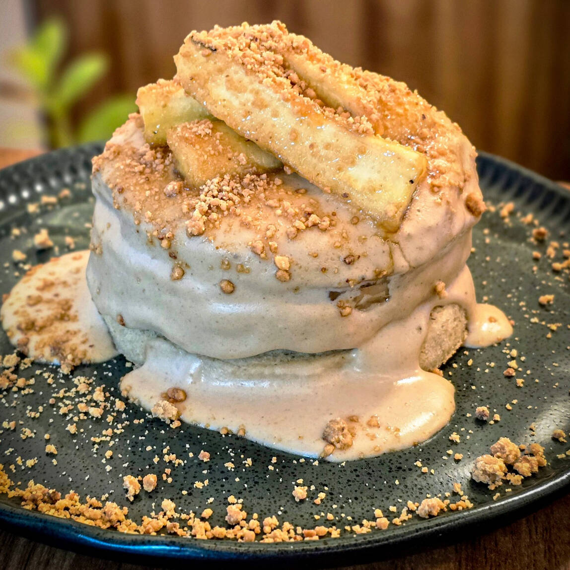 Panqueca de aveia, creme de paçoca e banana flambada.