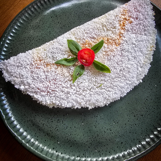 Tapioca recheada de queijo mussarela, tomate cereja e folhinhas de manjericão.