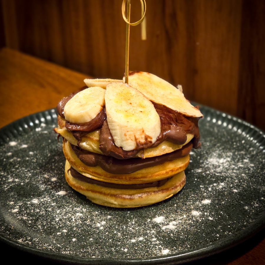 Panqueca no estilo americano coberta por Nutella e banana ou morangos fatiados.
