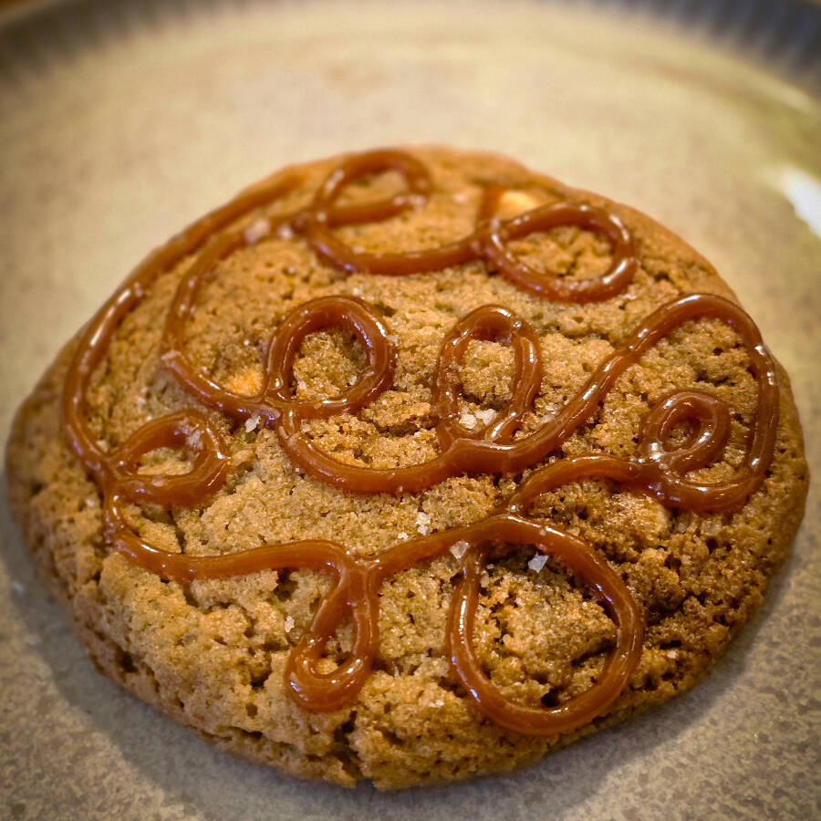 Cookie de chocolate com gotas de chocolate branco.