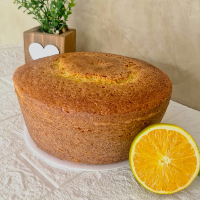 Bolo de laranja com massa fofinha e leve, feito com suco natural de laranja, que realça o sabor intenso e fresco da fruta. 🍊 Um sabor caseiro, simples e delicioso Rede aproximadamente 10 a 12 fatias