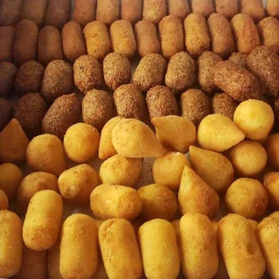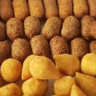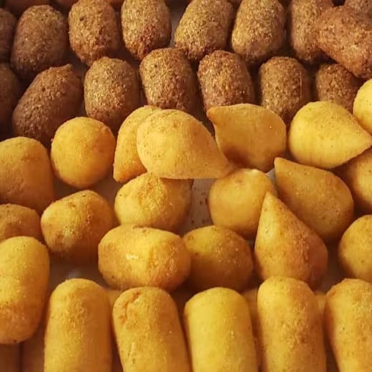 Coxinha, bolinha de queijo, enroladinho de salsicha, queijo com presunto, calabresa com queijo e kibe