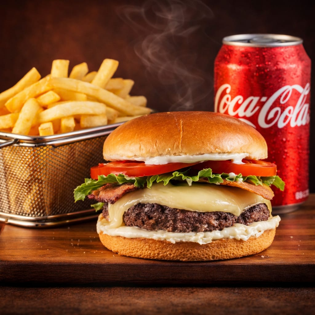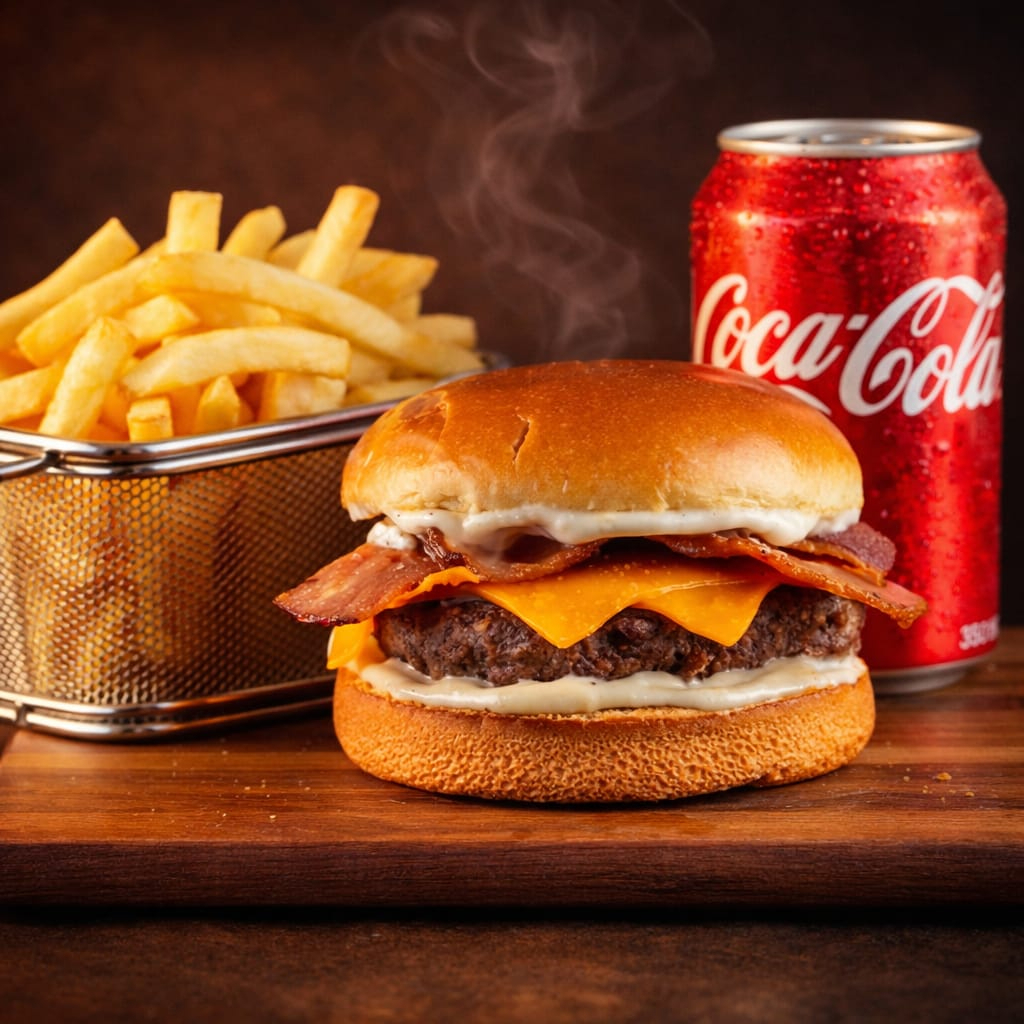 Bacon crispy, batata frita e refrigerante.