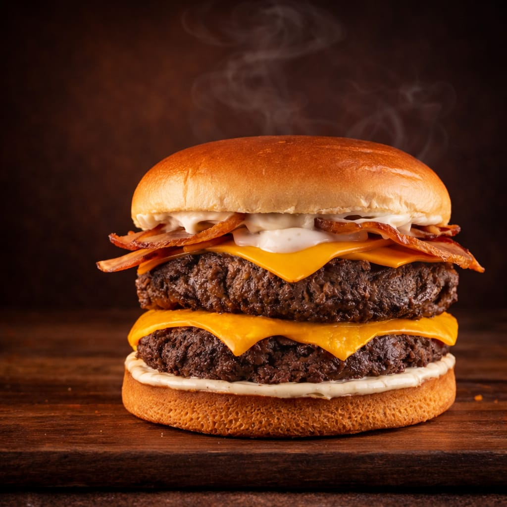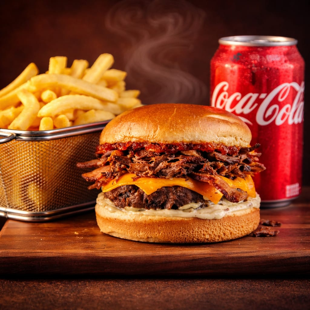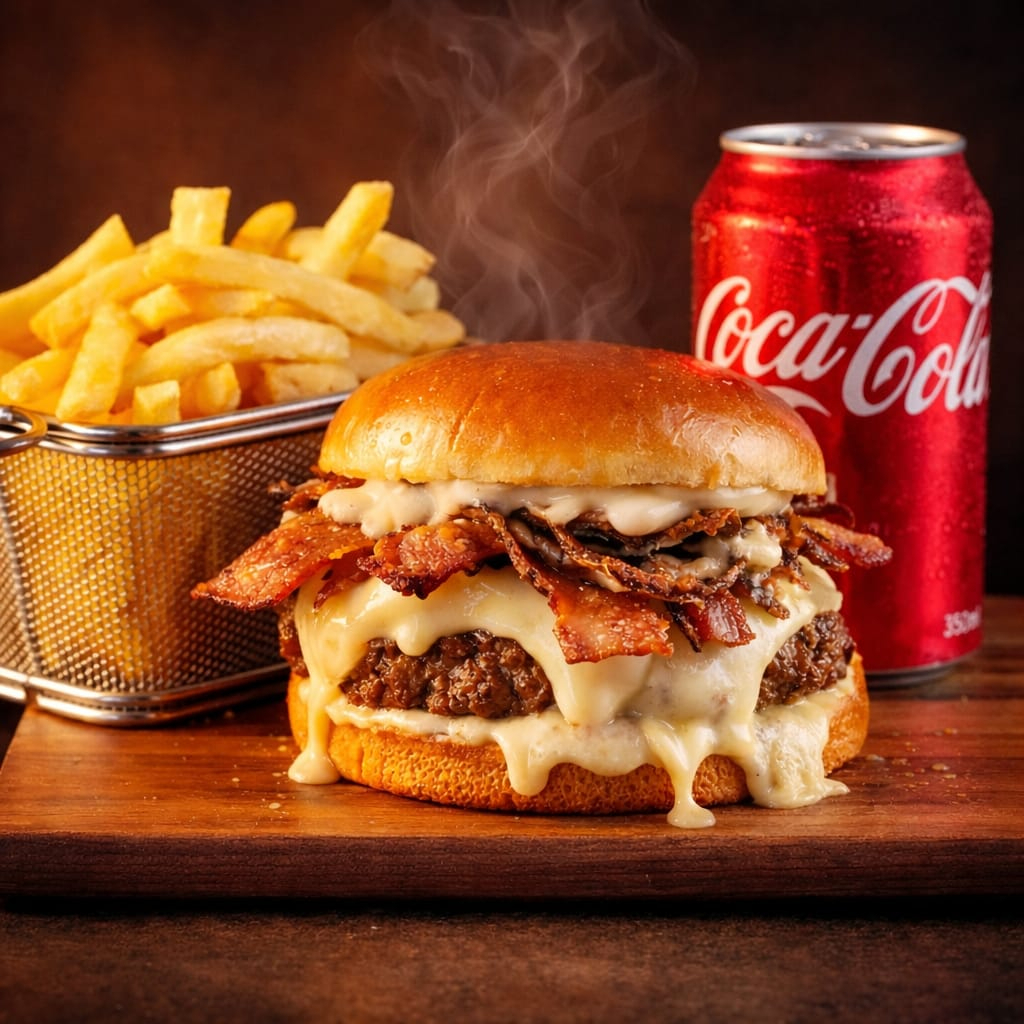 Para os amantes de um sabor intenso, este hambúrguer traz 2 suculentos blend na brasa de 140 gr cada, cobertas com duas camadas de cheddar derretido e fatias crocantes de bacon e molho. Servidos em um pão brioche macio e tostado. Uma explosão de sabores que vai satisfazer até os maiores apetites!