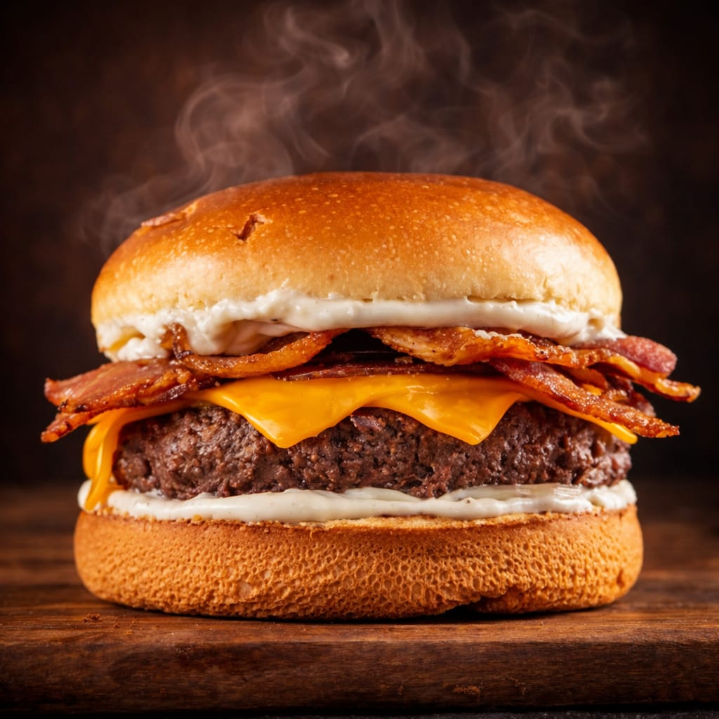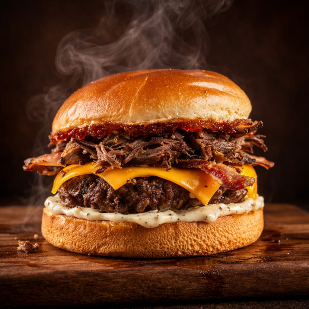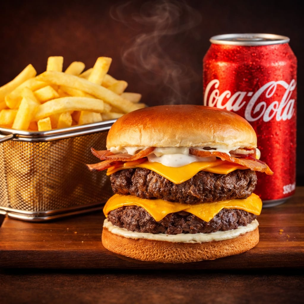 Para os amantes de um sabor intenso, este hambúrguer traz 2 suculentos blend na brasa de 140 gr cada, cobertas com duas camadas de cheddar derretido e fatias crocantes de bacon e molho. Servidos em um pão brioche macio e tostado. Uma explosão de sabores que vai satisfazer até os maiores apetites!