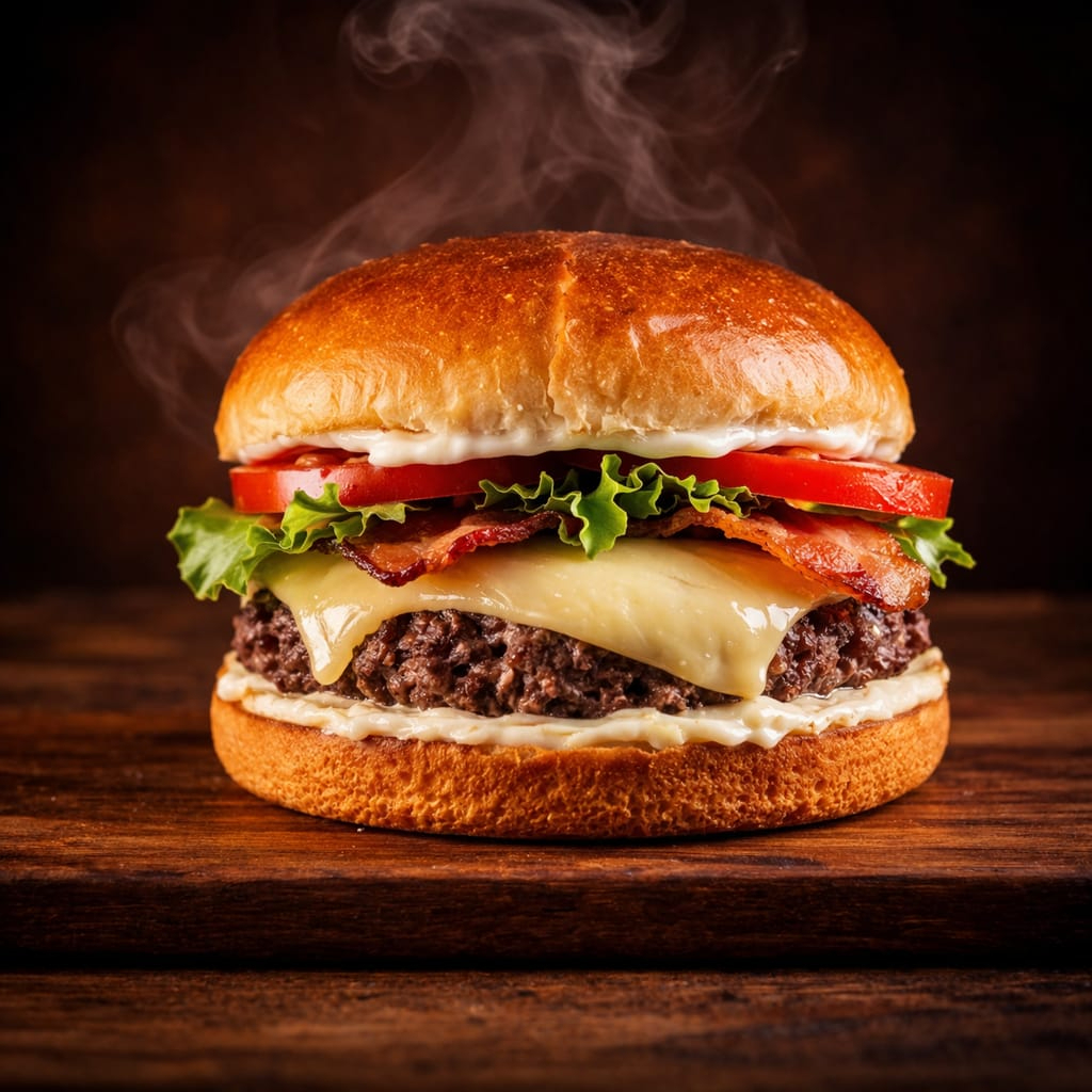 Pão brioche, blend, bacon, muçarela, alface americana, tomate e cebola e molho de queijo.