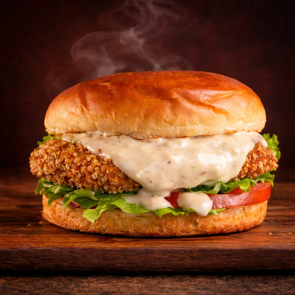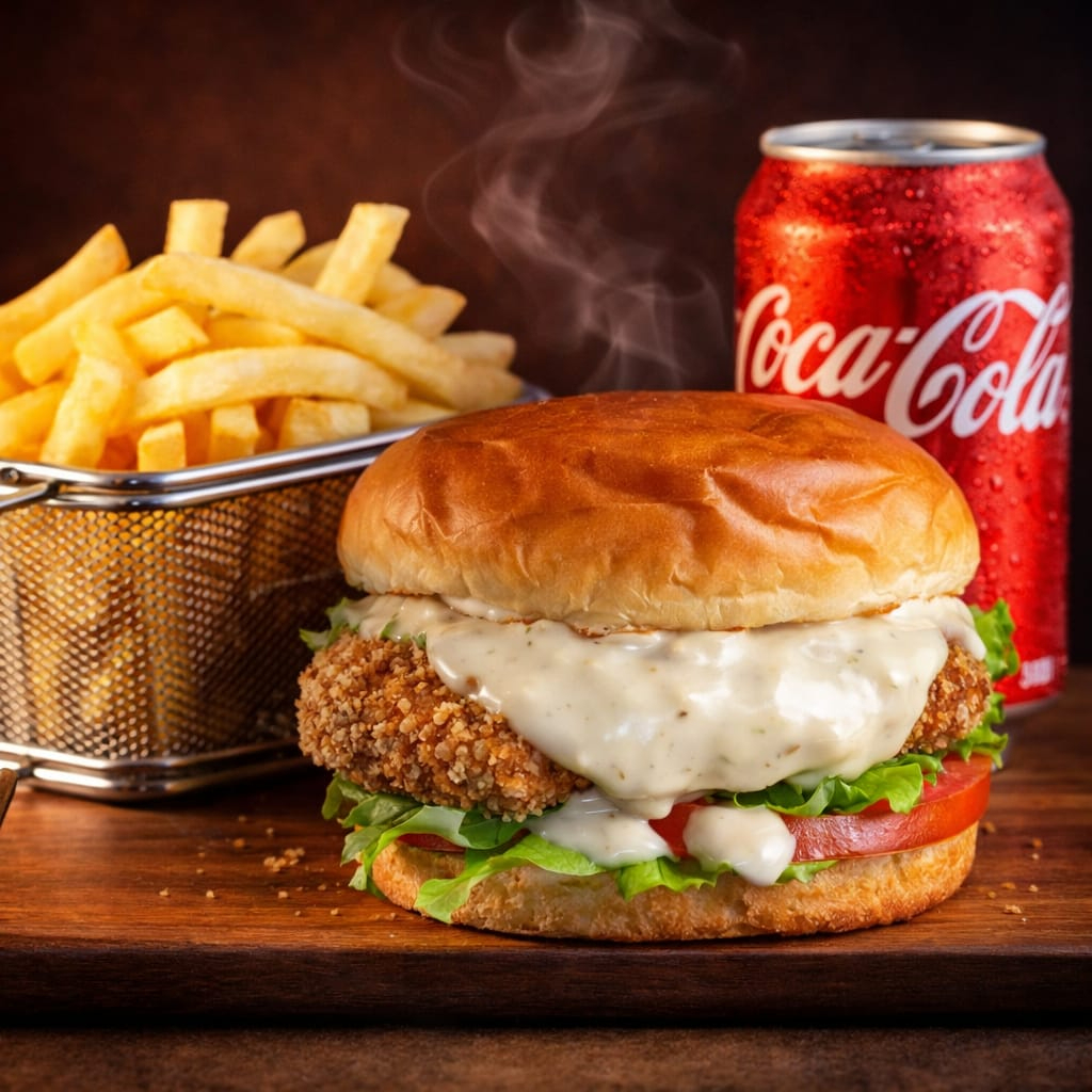 Pão brioche, frango empanado delicioso, tomate, alface americana e molho especial saboroso