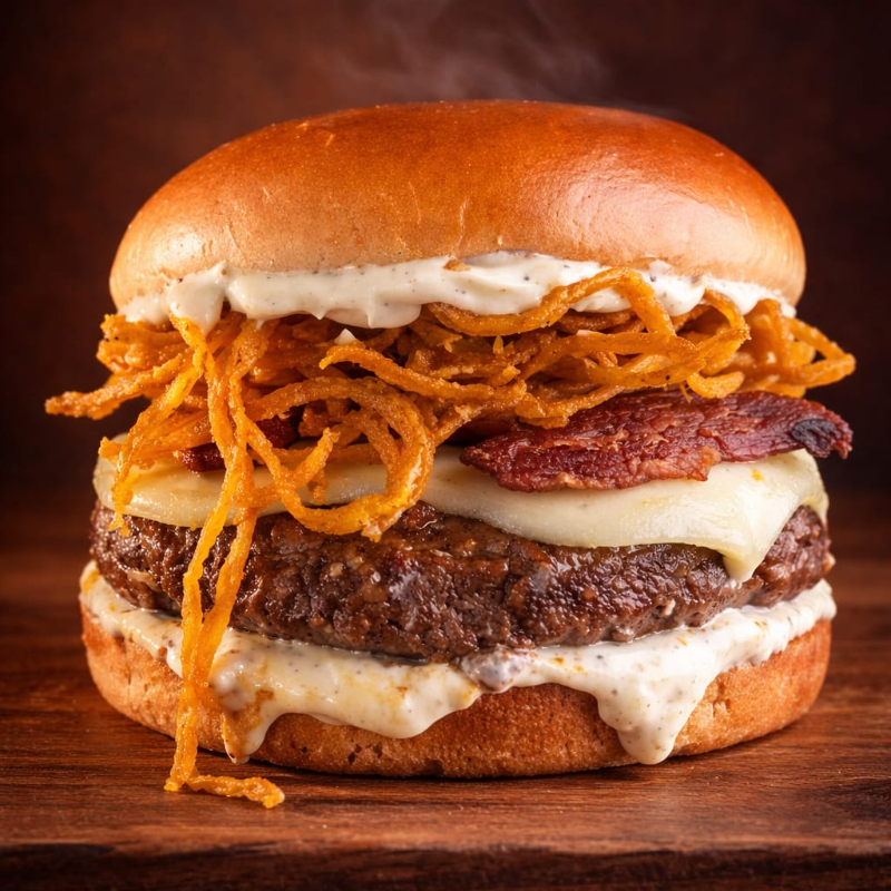 Para os verdadeiros fãs de bacon, este hambúrguer é uma celebração de sabor! Um suculento blend na brasa de 140 gr, coberta com muçarela derretida, uma camada crocante de bacon, cebola crispy deliciosa e molho de alho. Para elevar ainda mais a experiência, finalizamos com um molho de bacon cremoso que combina perfeitamente. Tudo isso servido em um pão brioche macio e levemente tostado. Prepare-se para uma explosão de sabores irresistíveis!