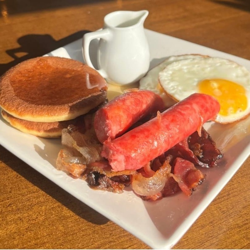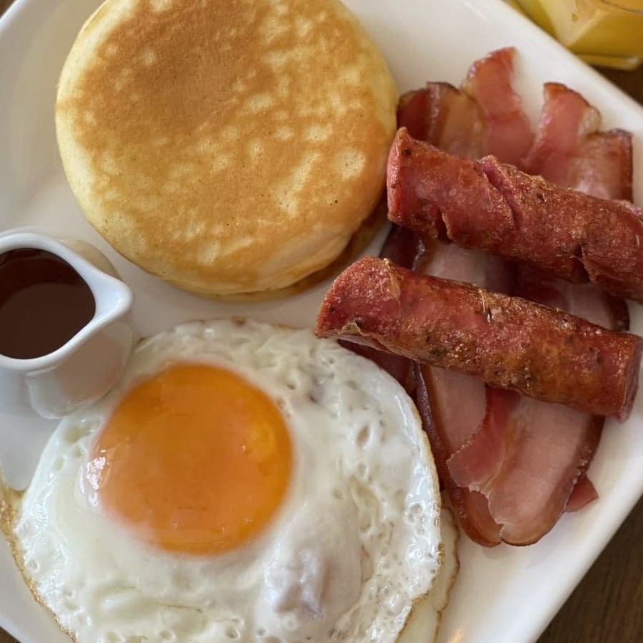 2 panquecas americanas, 2 ovos estrelados perfeitos, bacon, linguiça e mel.