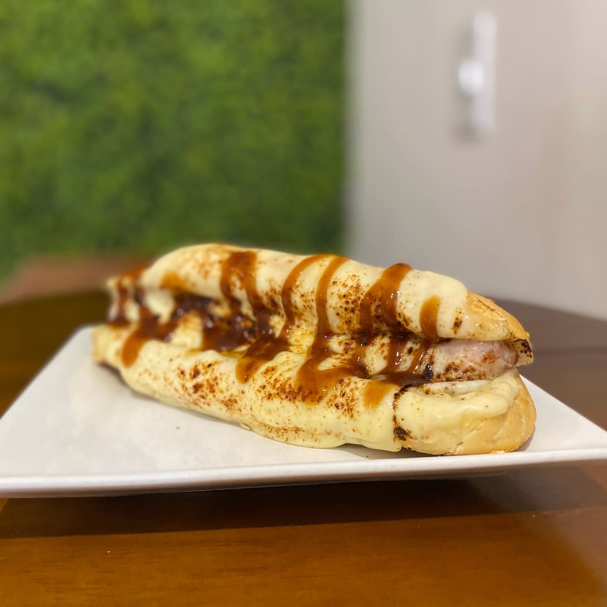 Pão parmesão recheado com linguiça mineira, mozzarella maçaricada e molho barbecue.