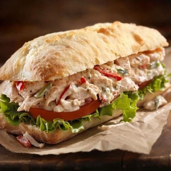 Pão de parmesão recheado com Nosso Chicken Cerino feito com frango desfiado, requeijão, bacon artesabal, alface e tomate orgânico.
