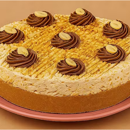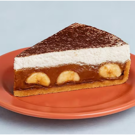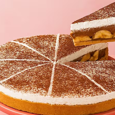 A tradicional e sofisticada torta à base de biscoito com uma camada do nosso doce de leite artesanal, ganache de chocolate, bananas frescas e selecionadas, uma cobertura caprichada de chantilly e uma generosa quantidade de cacau polvilhado.