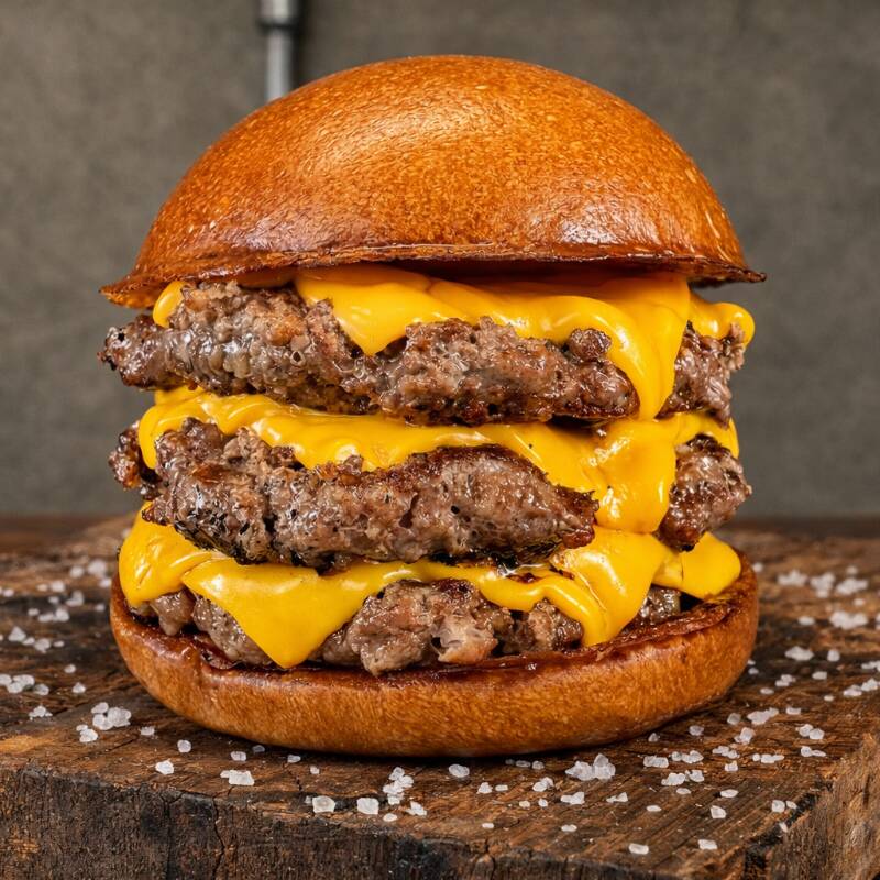 Pão de Brioche, Três Carnes Blend Angus 150gr, Duas Fatias de Cheddar e Molho Especial.