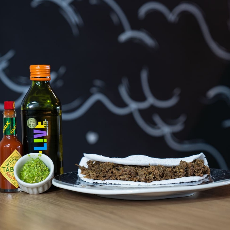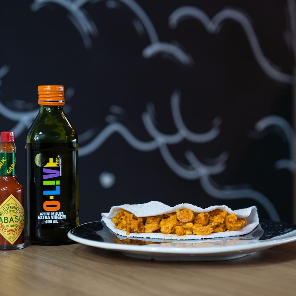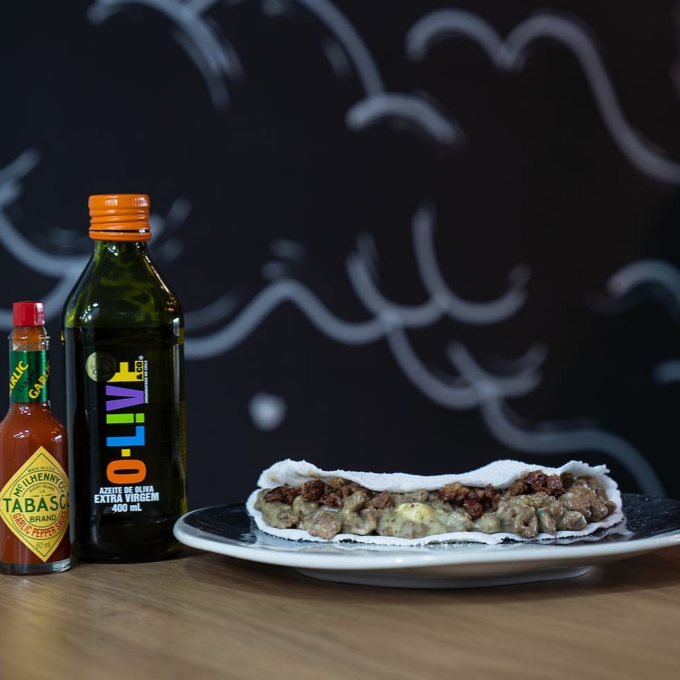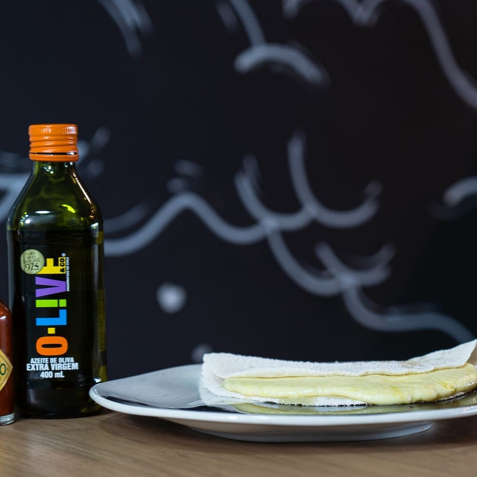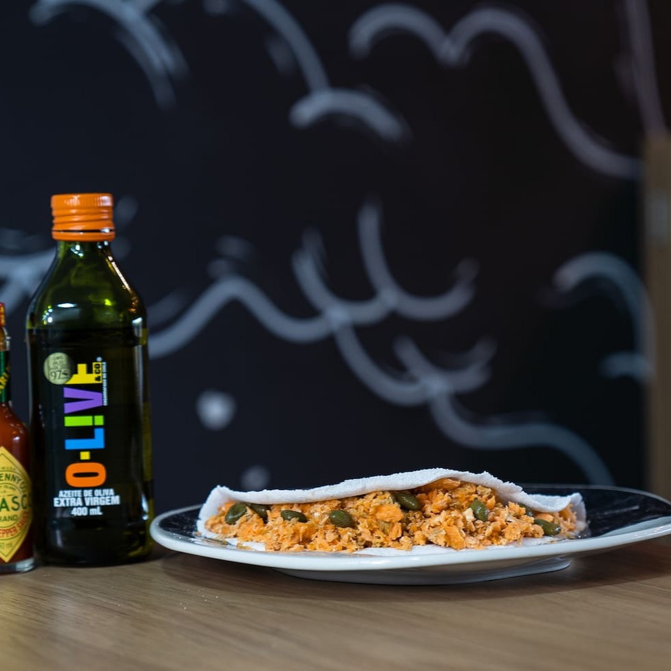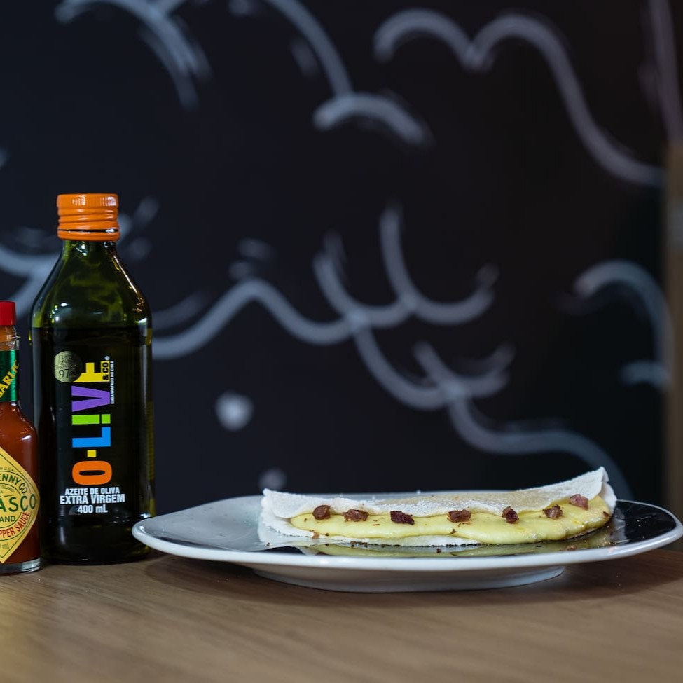 "Tapioca de Queijo canastra com azeitonas e cebola crispy. Preparado de forma artesanal com queijo canastra ""meia cura"", de sabor suave e bem marcante."
