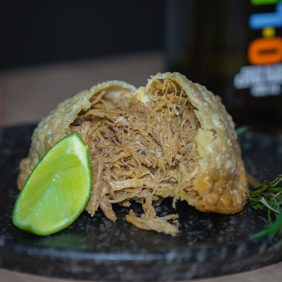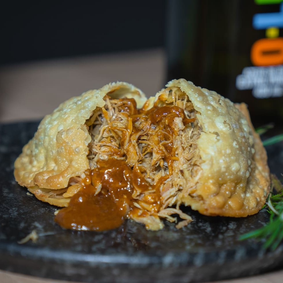 Pastel de pernil com barbecue Pernil de porco desfiado, refogado no alho e azeite, é uma opção saborosa e suculenta para os amantes de carne de porco. Massa fresca sem conservantes, , pastel sequinho de 12 cm.