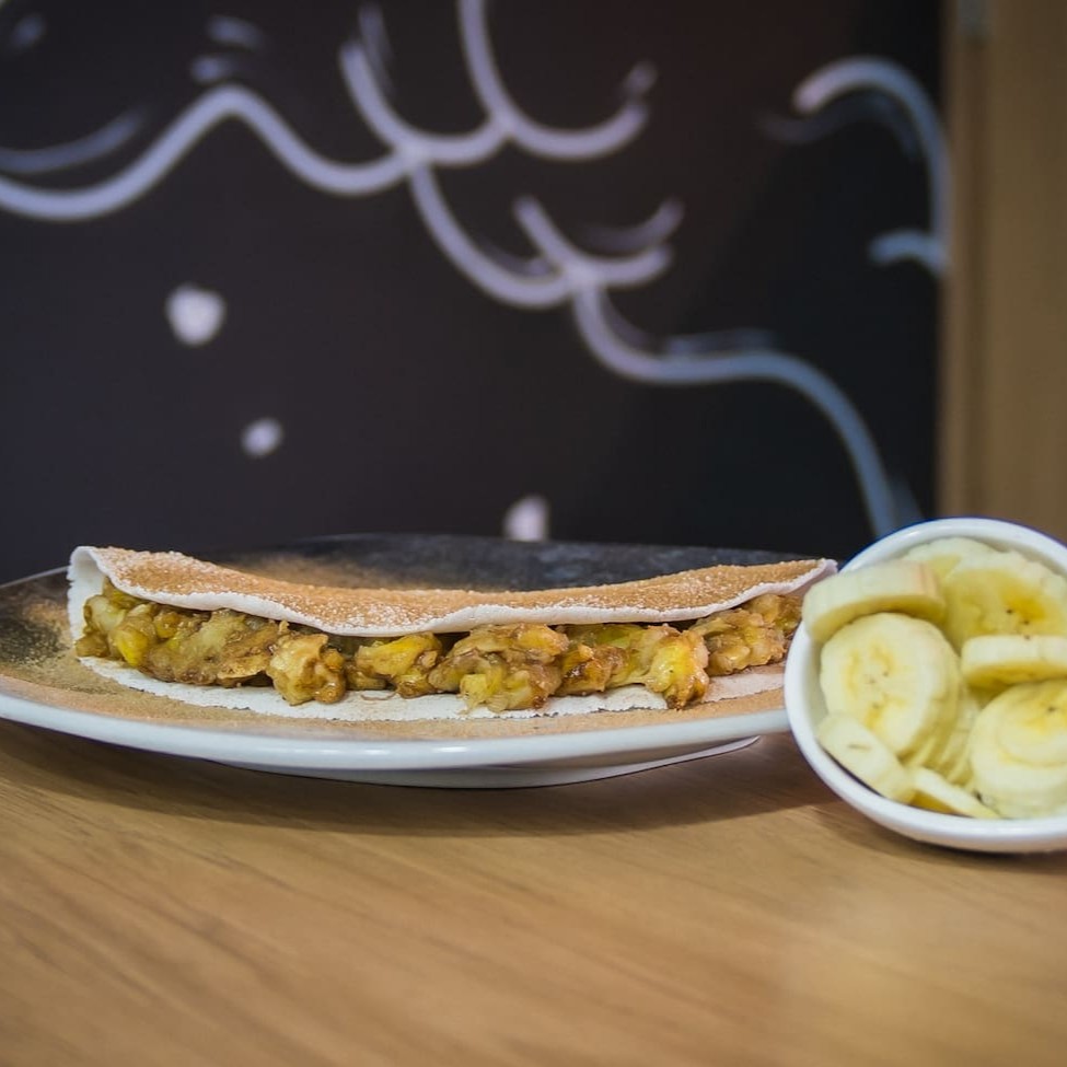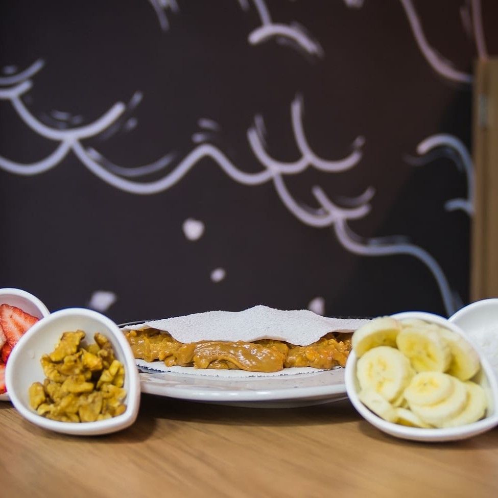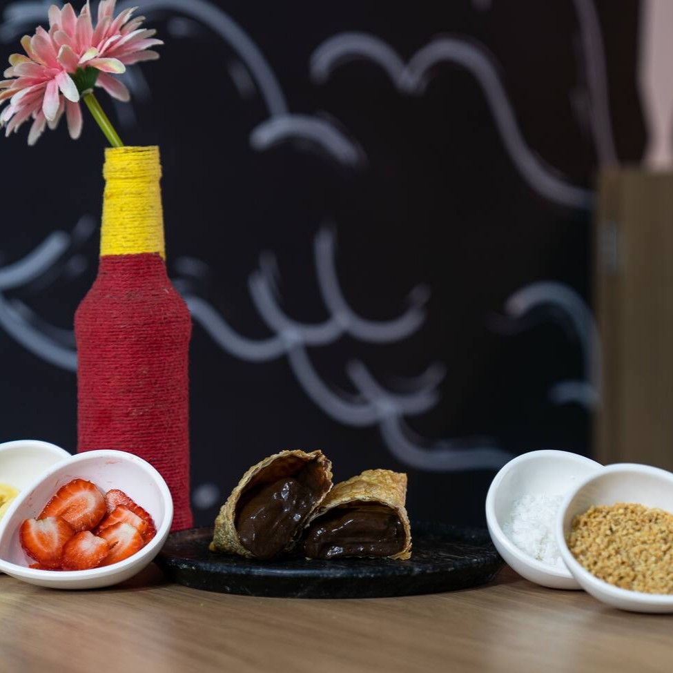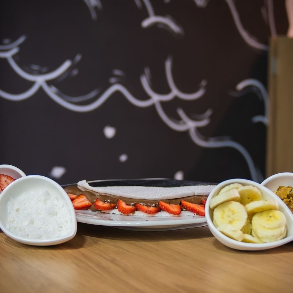 Tapioca de Nutella Com morango Creme de chocolate com avelã da marca Ferrero Rocher, garantindo seu sabor único - Massa fresca sem conservantes.