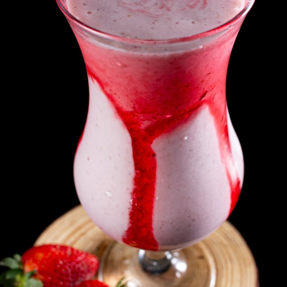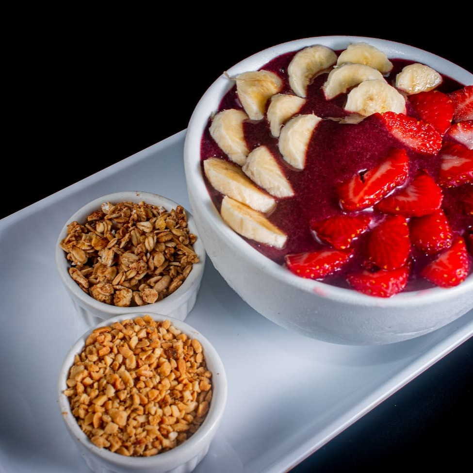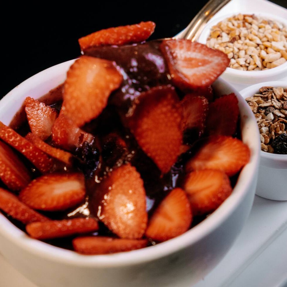 Açaí com Morango. Acompanha granola especial, amendoim,mel ou calda de chocolate ou morango.