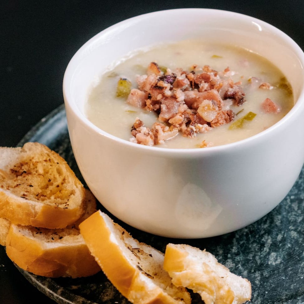 Delicioso creme de batata com calabresa picadinha e couve refolgada