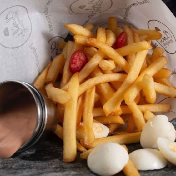 Batata palito 7mm, sequinha, acompanhada de linguiça fininha e ovo de codorna.