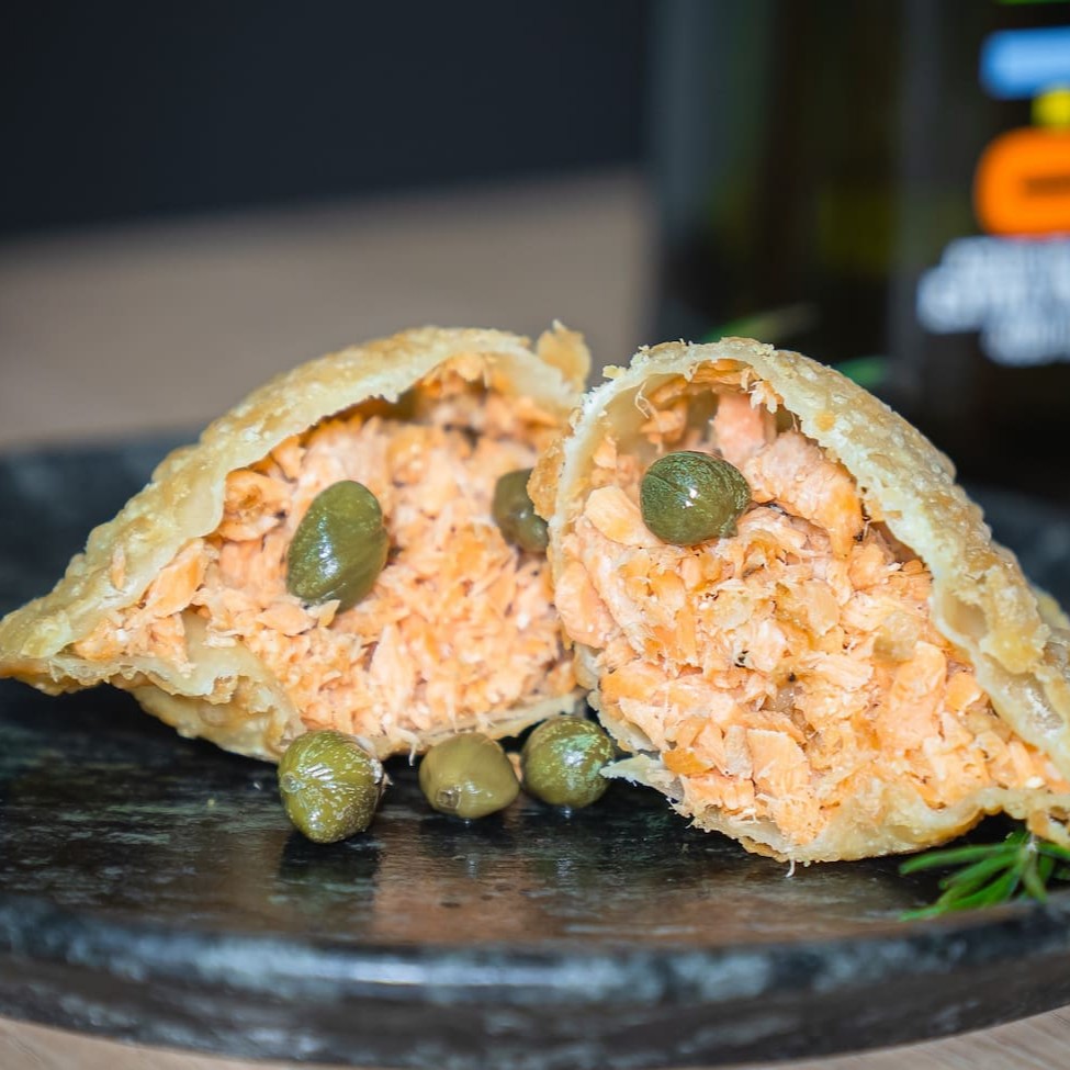 Pastel de salmão com azeite e alcaparraz O salmão possui sabor e textura suave. Além disso seu consumo traz vários benefícios à saúde, pois é rico em ômega 3, proteínas e reduz o colesterol. Massa fresca sem conservantes, pastel sequinho de 12 cm.