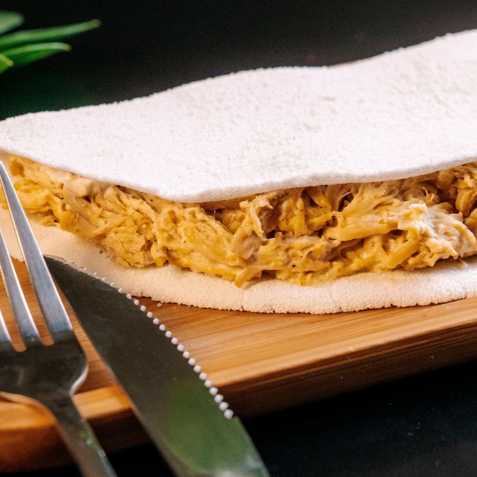 Tapioca de frango é desfiada, saborosa, combina com diversos acompanhamentos, diversificando sua alimentação de forma deliciosa e nutritiva. Massa fresca sem conservantes.