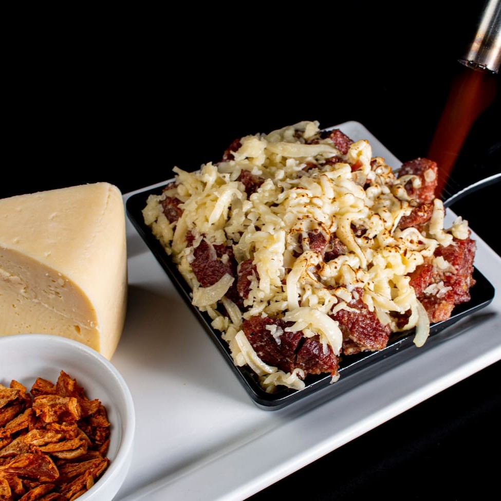 Carne seca refogada na manteiga com cebola, aipim frito. Gratinada com queijo padrão e alho frito salpicado