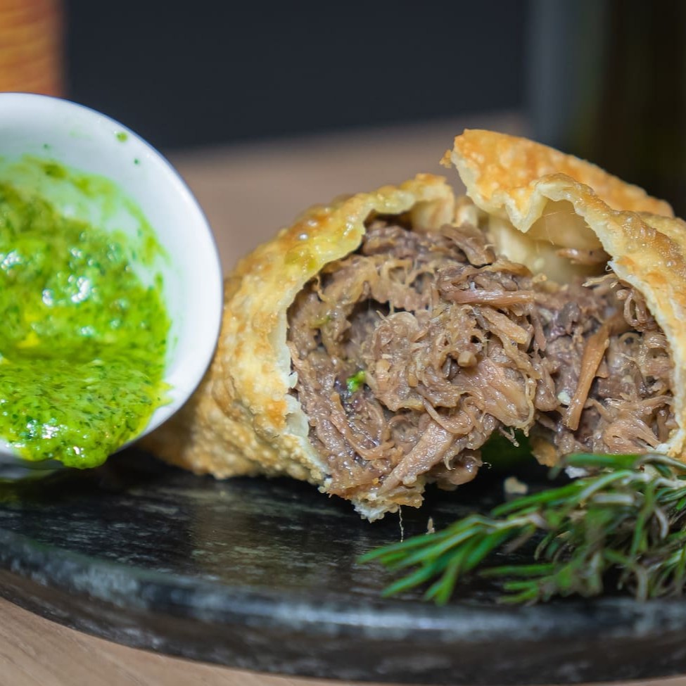 "Pastel de Queijo canastra com linguiça calabresa e cebola crispy. Preparado de forma artesanal com queijo canastra ""meia cura"", de sabor suave e bem marcante."