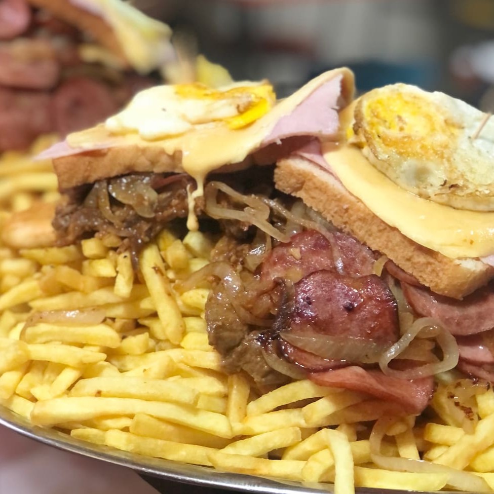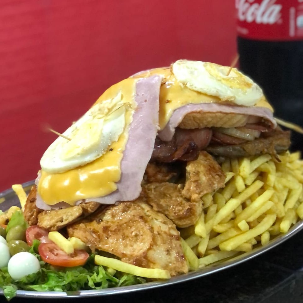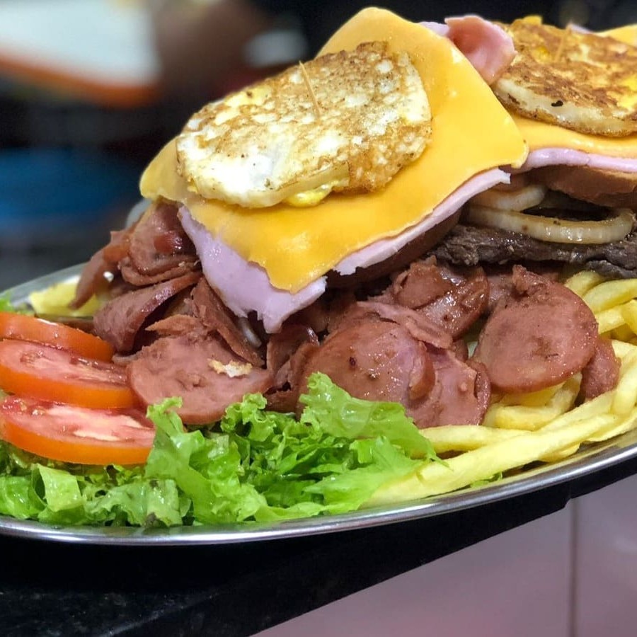 Pão, 2 hamburgueres, queijo, presunto, 2 ovos, catchup, maionese, batata palha, ovo de codorna, azeitona, salada, sal, azeite e queijo ralado
