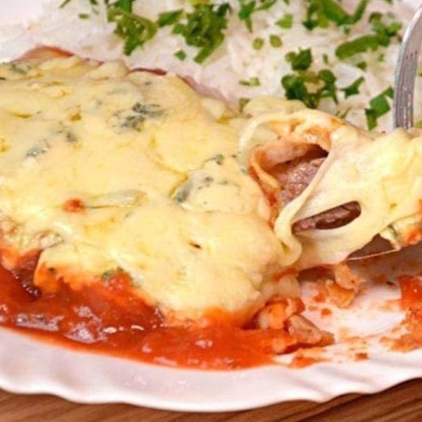Parmegiana ao molho barbucue com b. Frita arroz feijão e farofa.