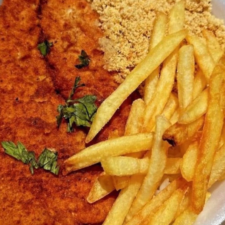 Um prato clássico e irresistível: frango à milanesa dourado e crocante por fora, suculento por dentro, acompanhado de arroz soltinho, feijão bem temperado e encorpado, farofa saborosa e crocante, e batatas fritas sequinhas. Uma combinação perfeita, caseira e cheia de sabor que conquista em cada garfada.