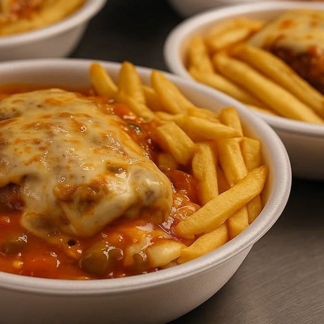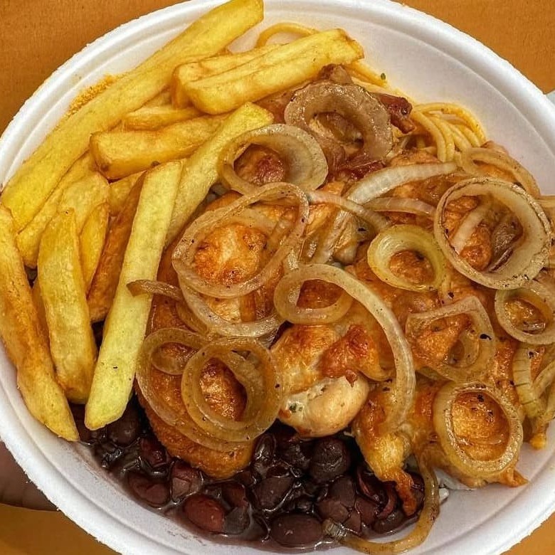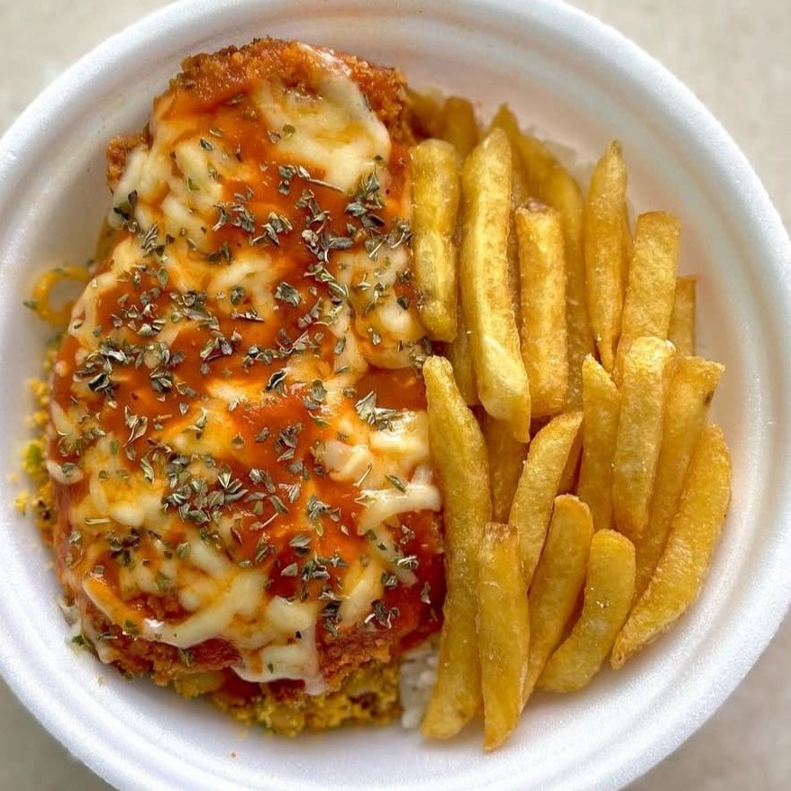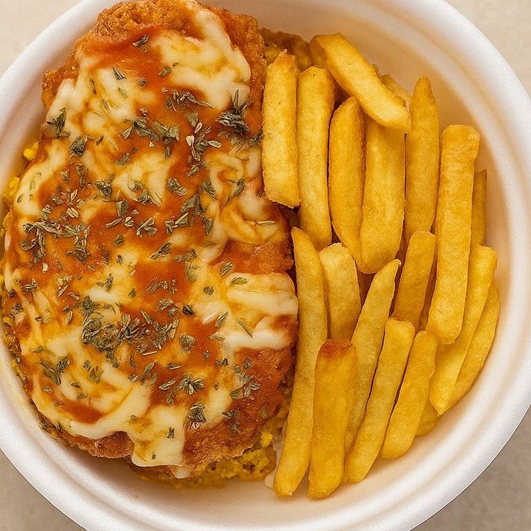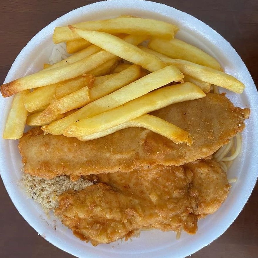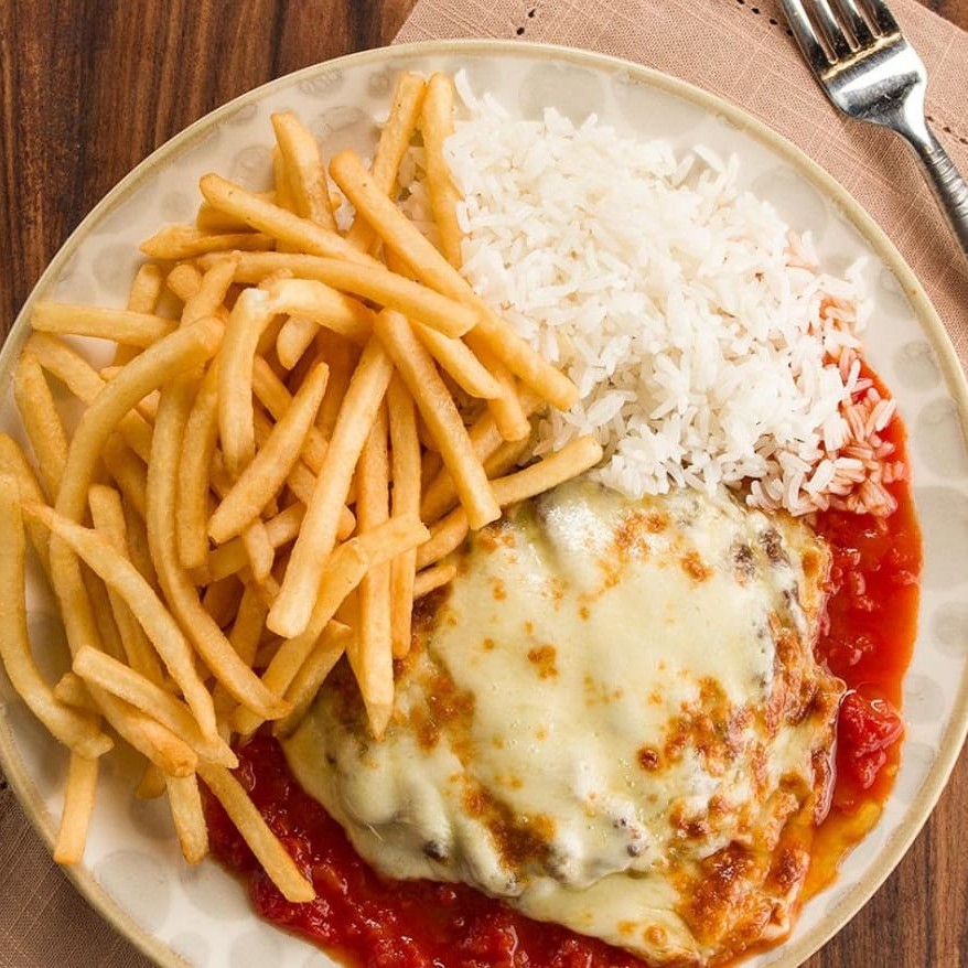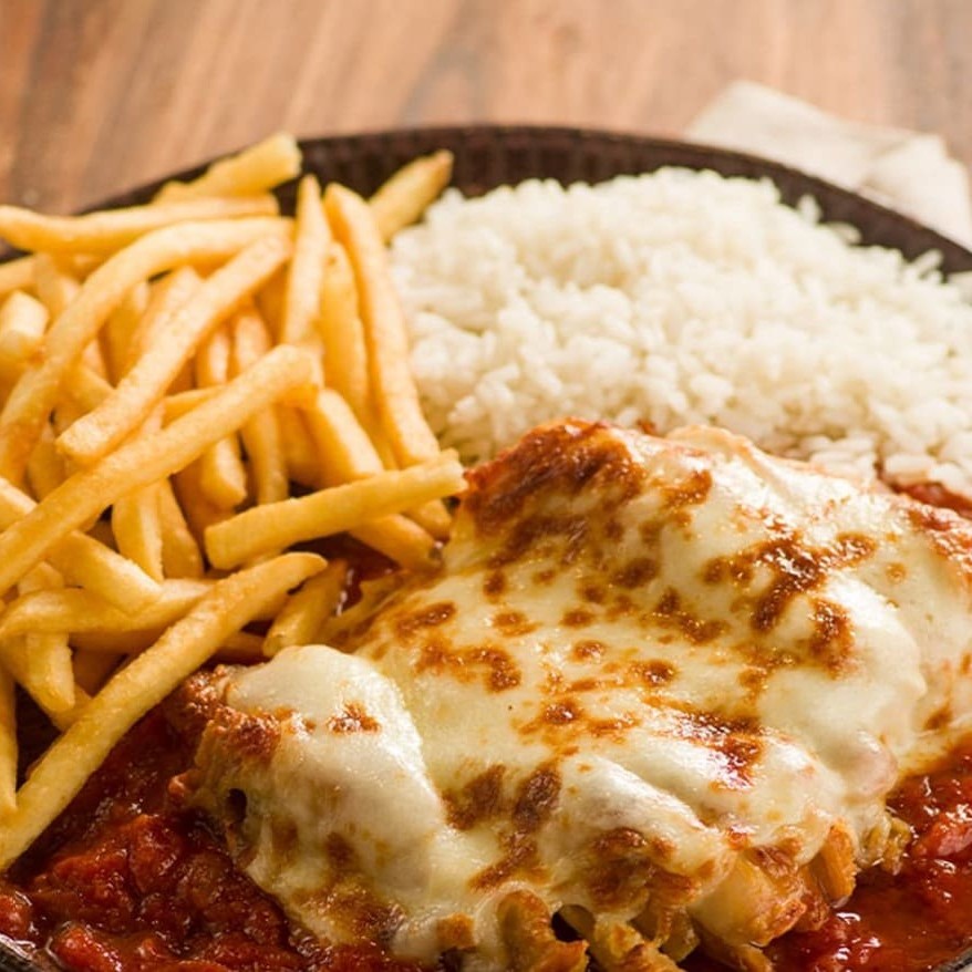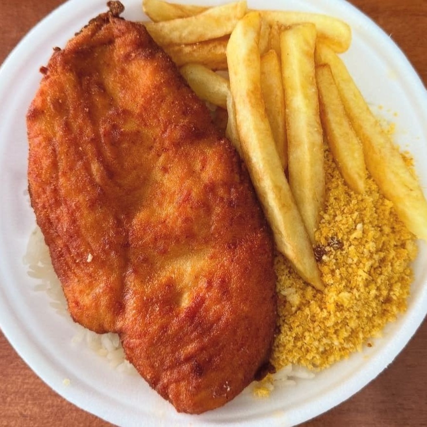 Um prato que é puro conforto: frango à parmegiana empanado e suculento, coberto com molho de tomate bem temperado e queijo derretido, acompanhado de arroz soltinho, feijão encorpado, farofa crocante e batatas fritas douradas. Uma combinação generosa e irresistível, perfeita para matar a fome com muito sabor.