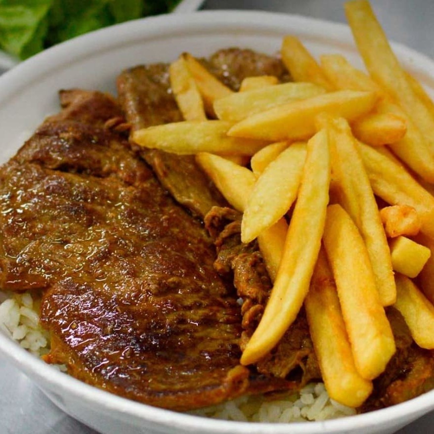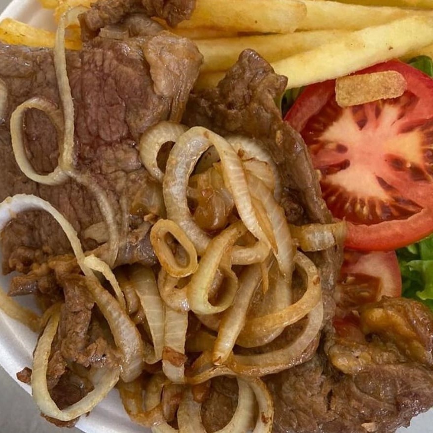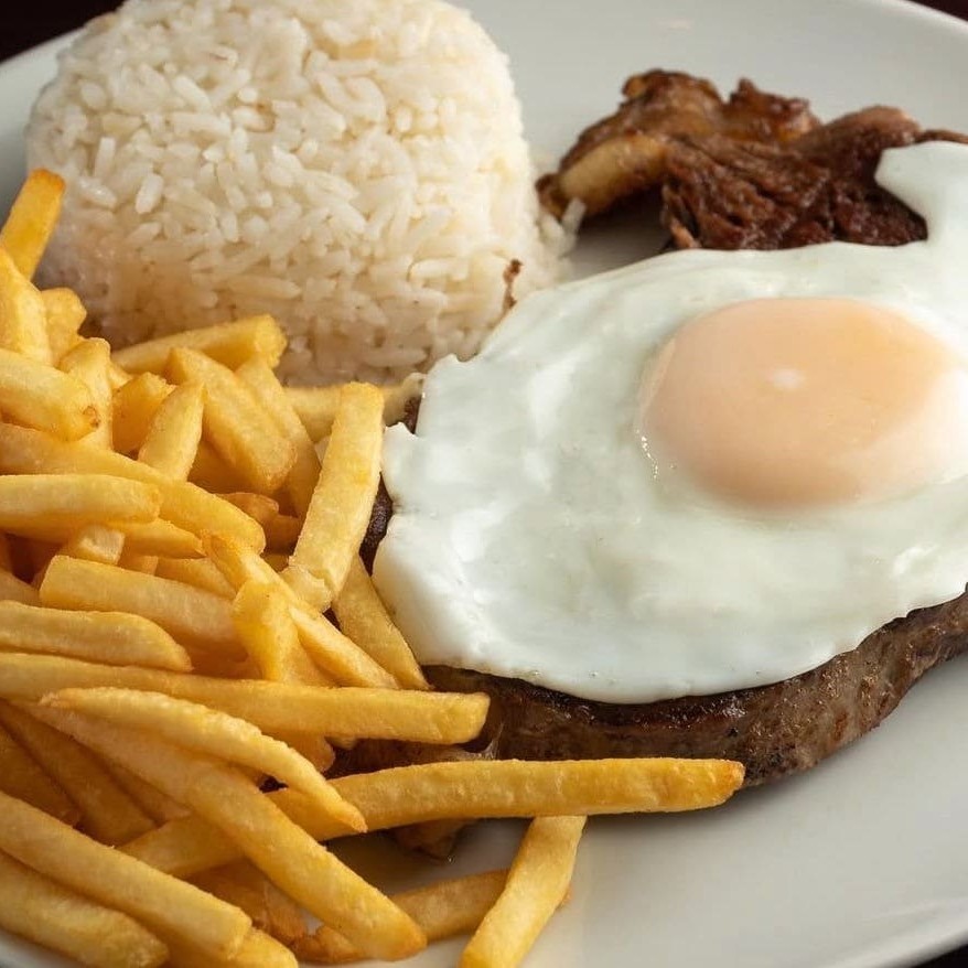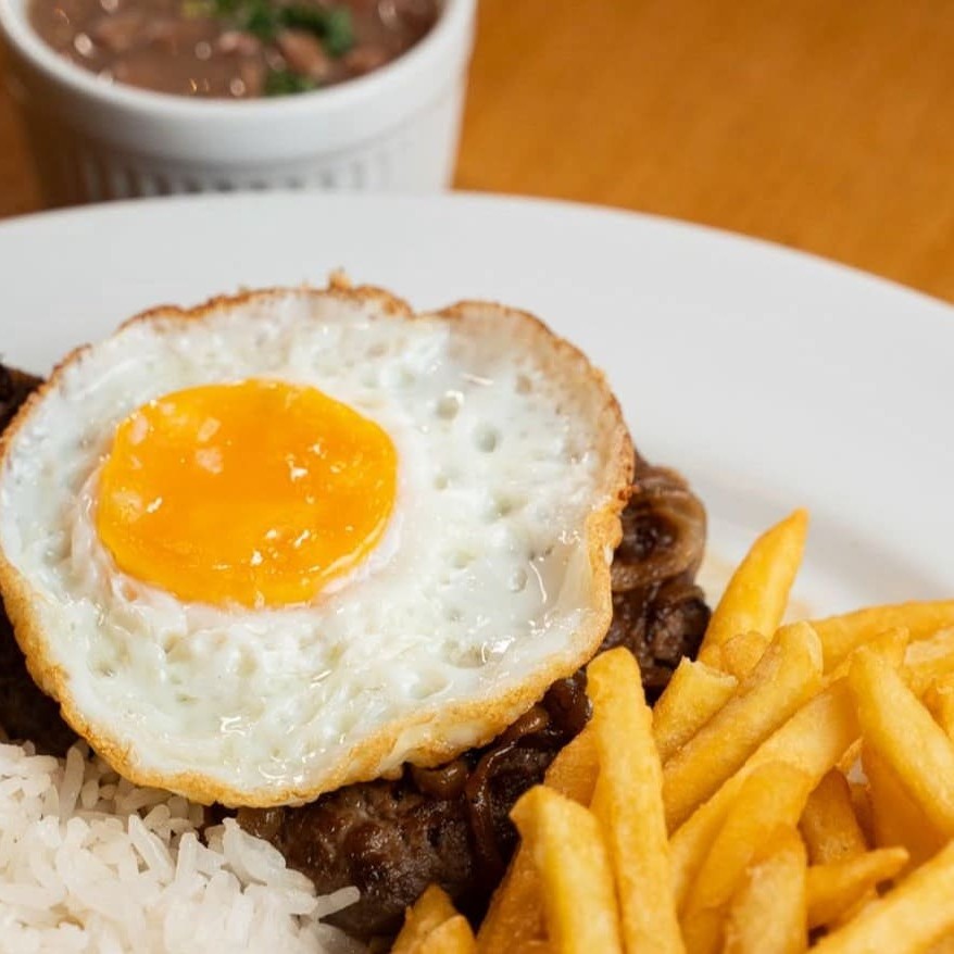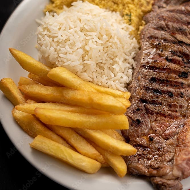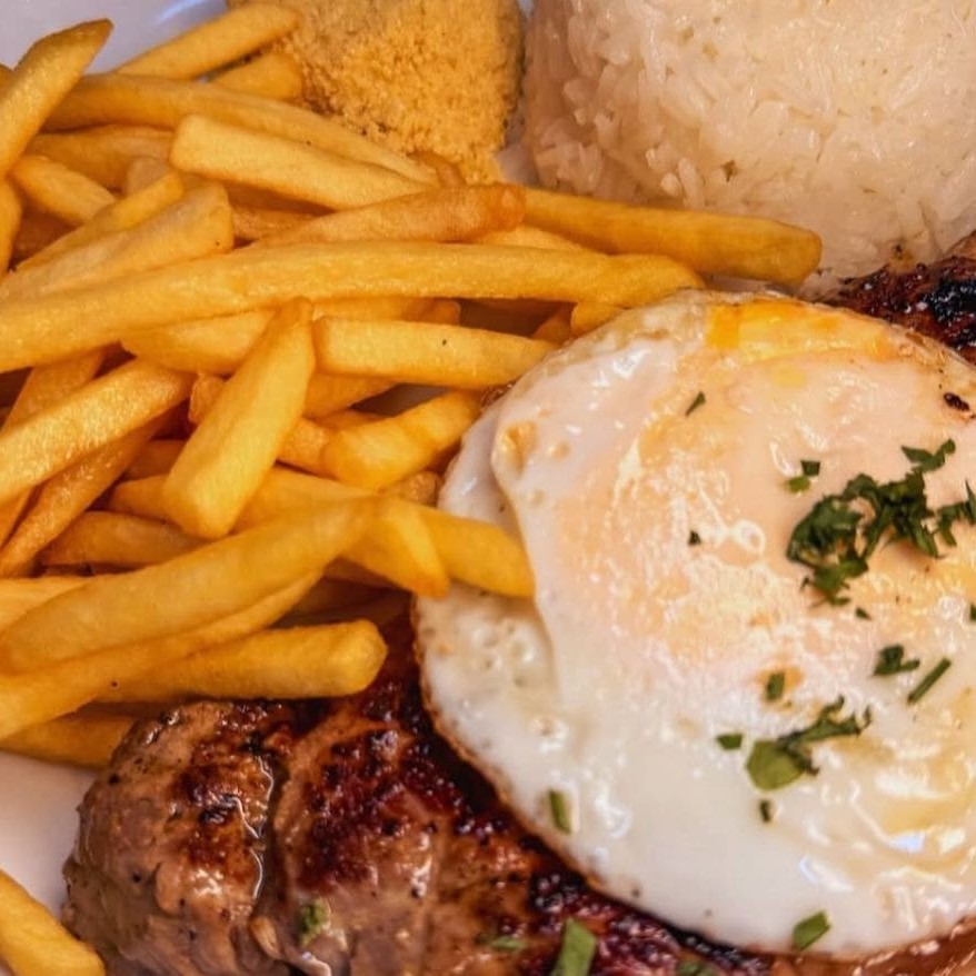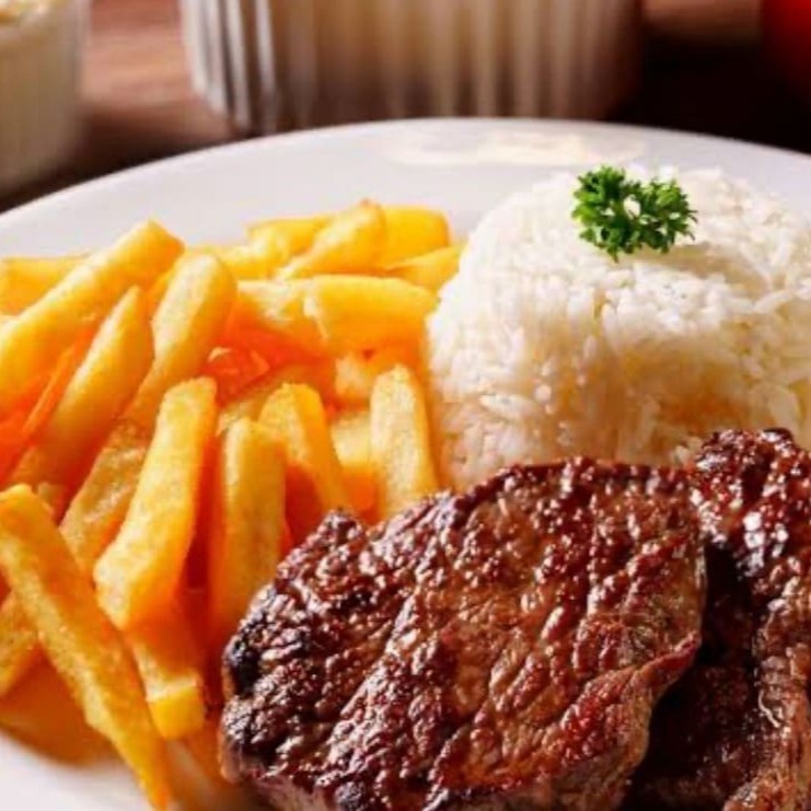 Um delicioso bife grelhado no ponto certo, macio e cheio de sabor, acompanhado da sua escolha: batatas douradas e crocantes, uma leve e refrescante salada verde ou um ovo frito com gema cremosa. Você monta do seu jeito, do jeitinho que mais gosta.