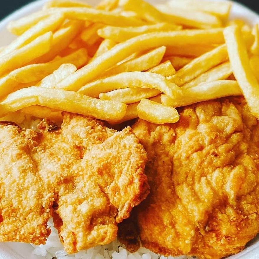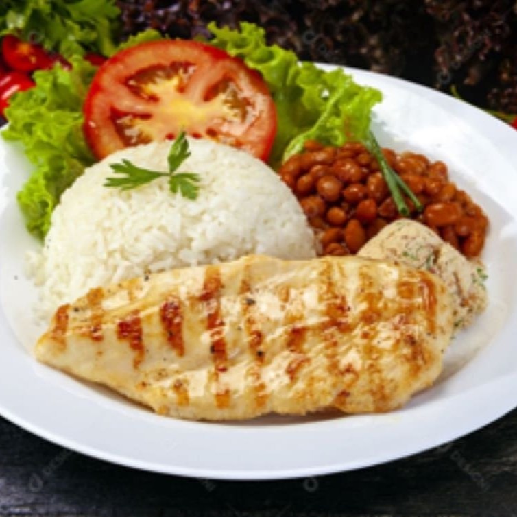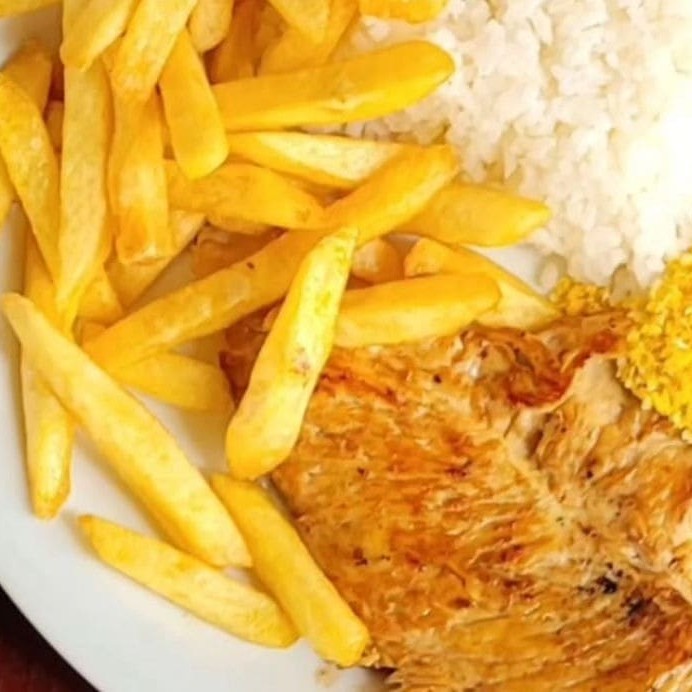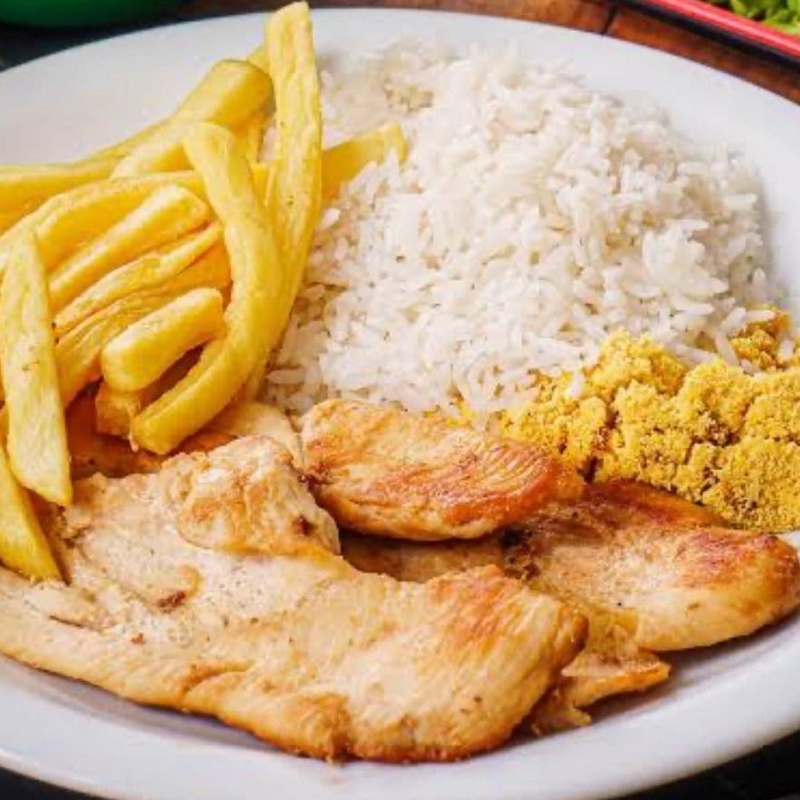 Uma opção leve e deliciosa: frango grelhado suculento e bem temperado, acompanhado de arroz soltinho, feijão encorpado, farofa crocante e batatas fritas douradas. Um prato equilibrado, cheio de sabor e perfeito para qualquer momento do dia.