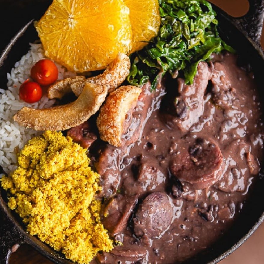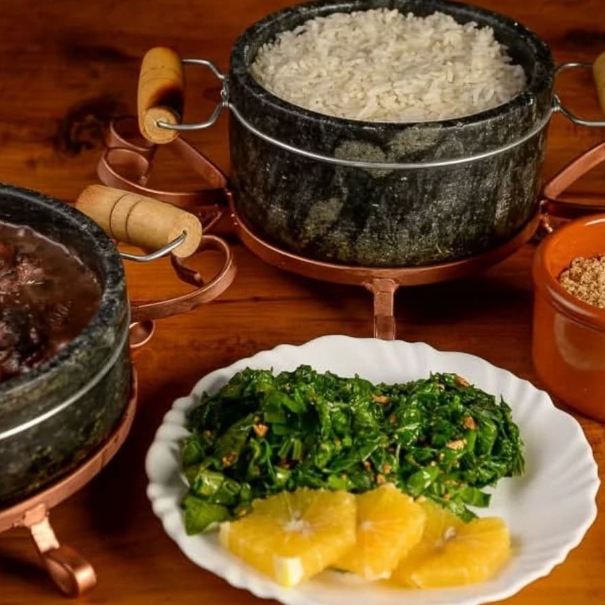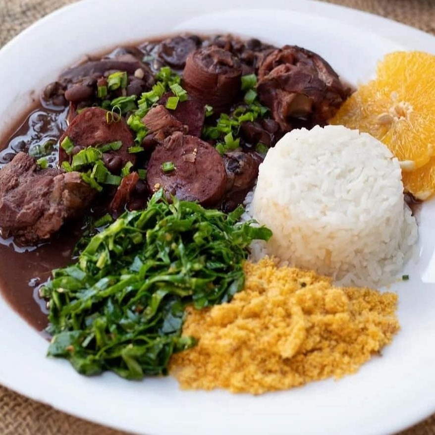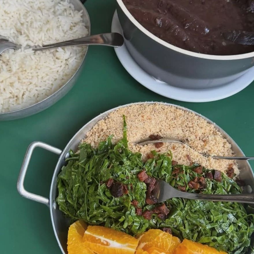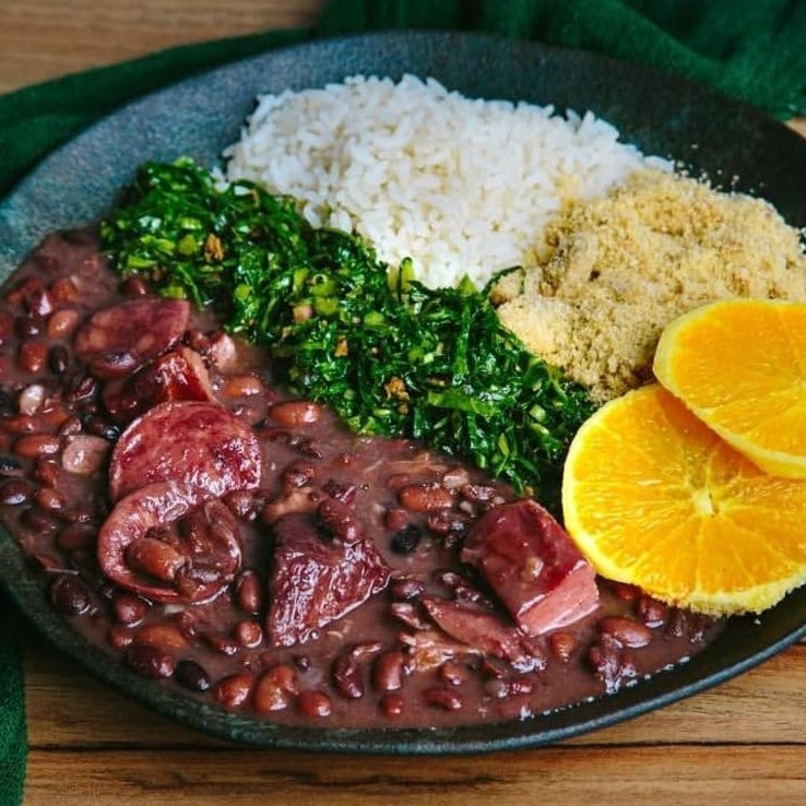 As duas feijoada acompanham arroz, farofa, couve e laranja