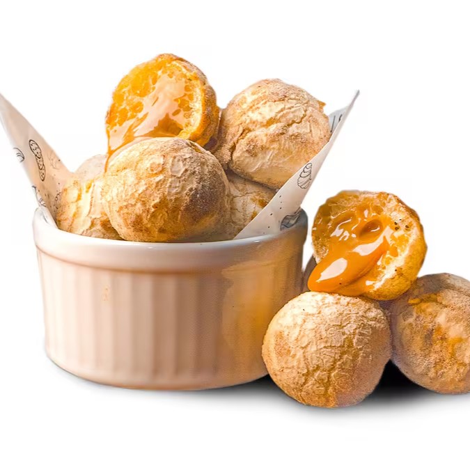 Deliciosos mini pães de queijo recheados com o doce de leite artesanal Cheirin Bão, envoltos em uma deliciosa camada de açúcar de confeiteiro com canela. Uma verdadeira tentação em cada mordida!