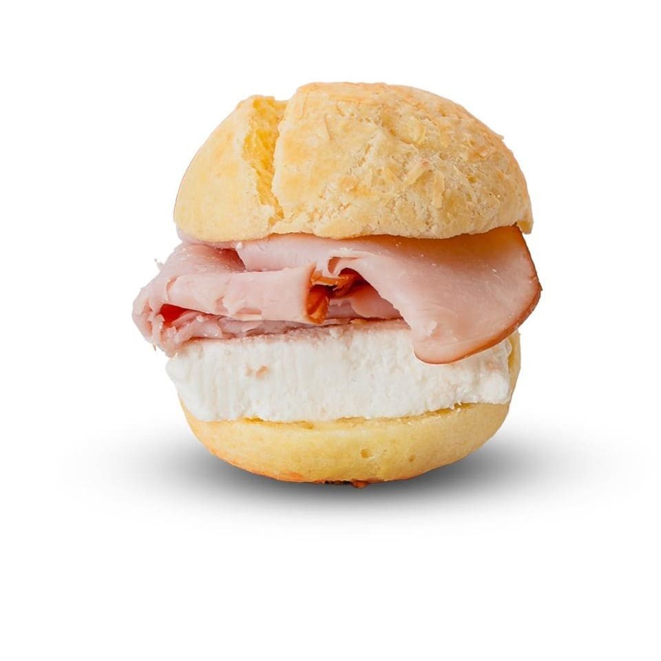 Sanduíche de pão de queijo recheado com queijo minas ou queijo muçarela.