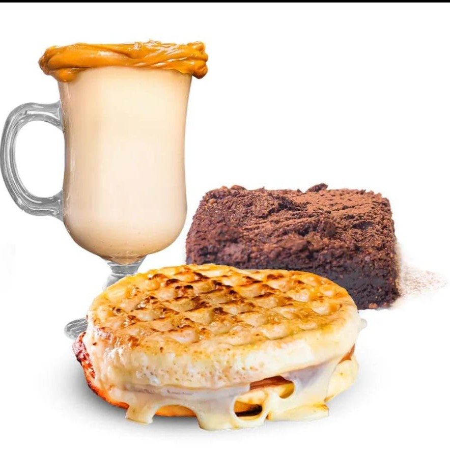1 Waffle do chef, cappuccino 240ml e 1 brownie chocolate.