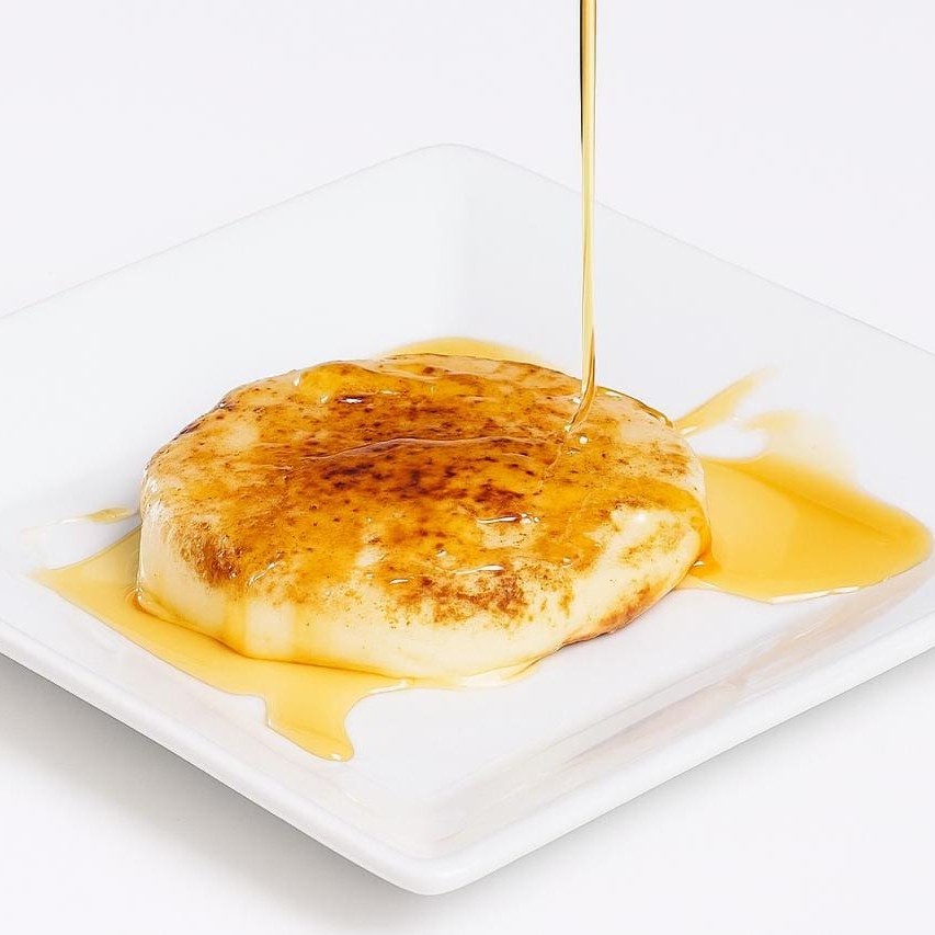 Waffle de pão de queijo, com queijo muçarela gratinado e melaço.