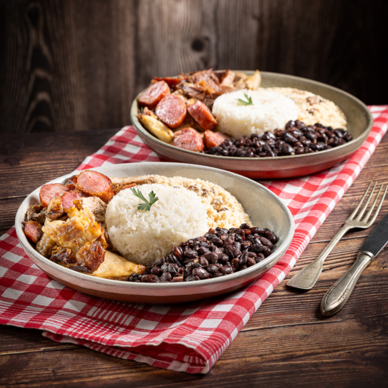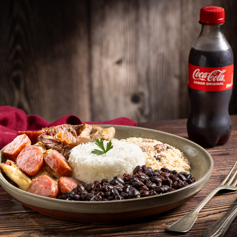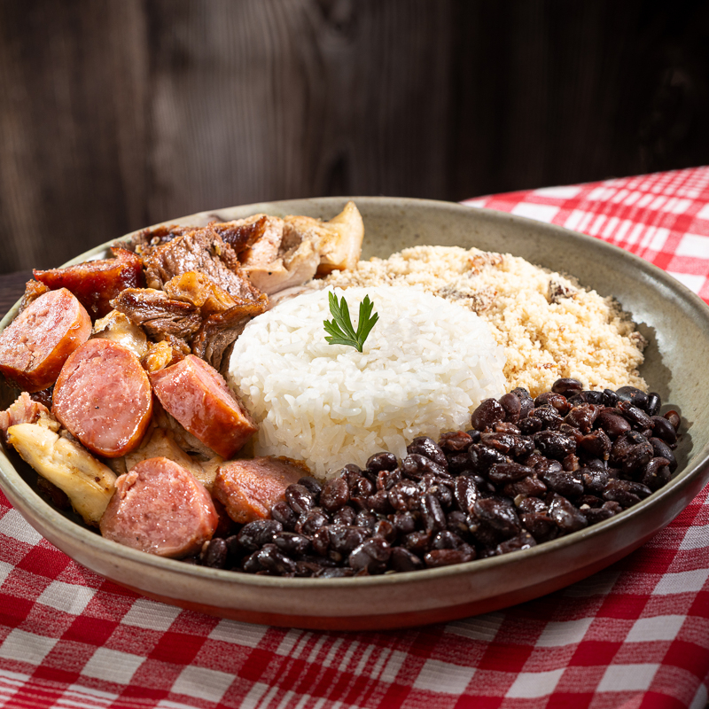 Campeão de vendas com 150g feijão. 240g de Arroz soltinho, 160g de churrasco misto, sobrecoxa na brasa, linguiça e paleta suina feito na brasa e 60gfarofa caseira do cheff...